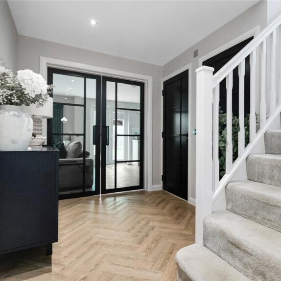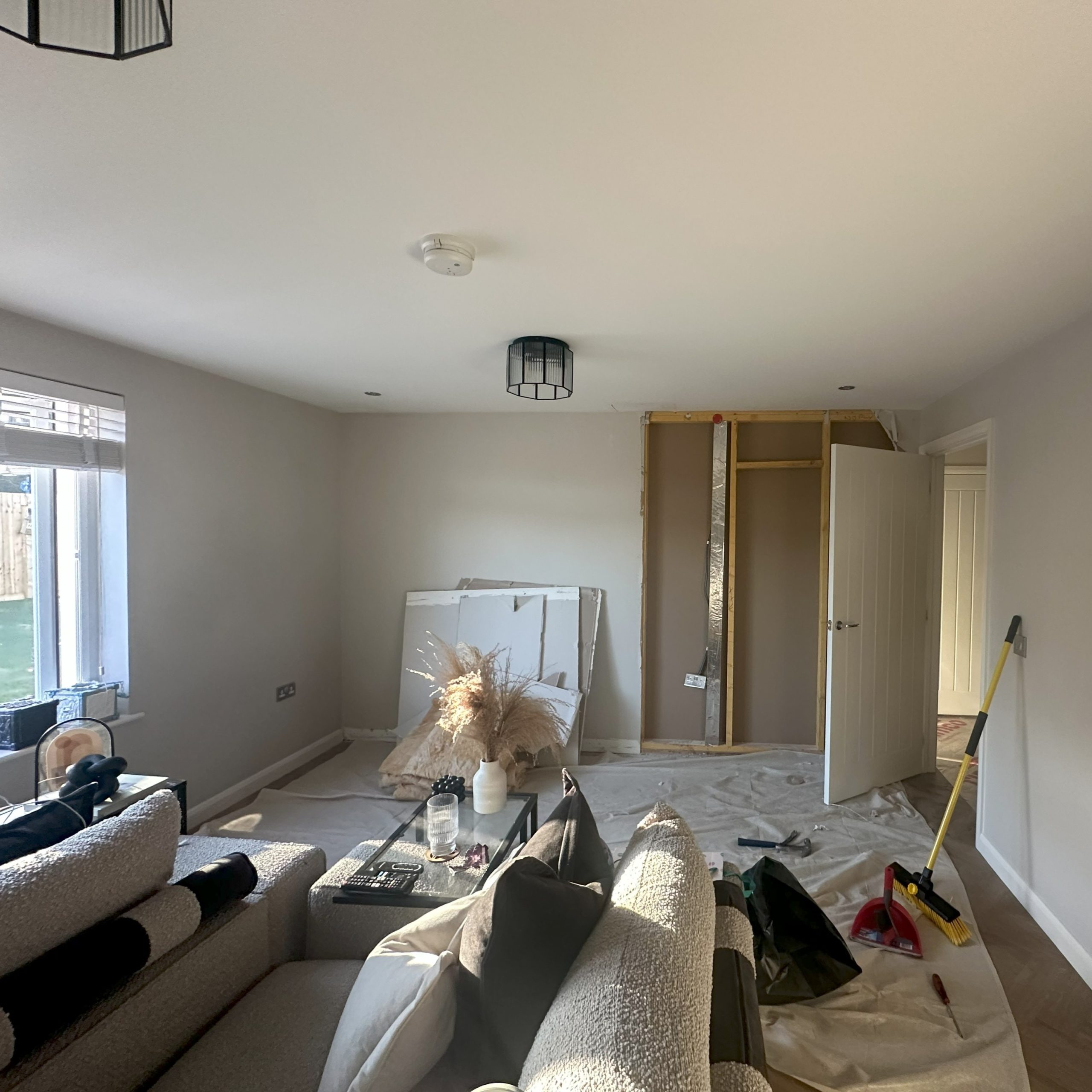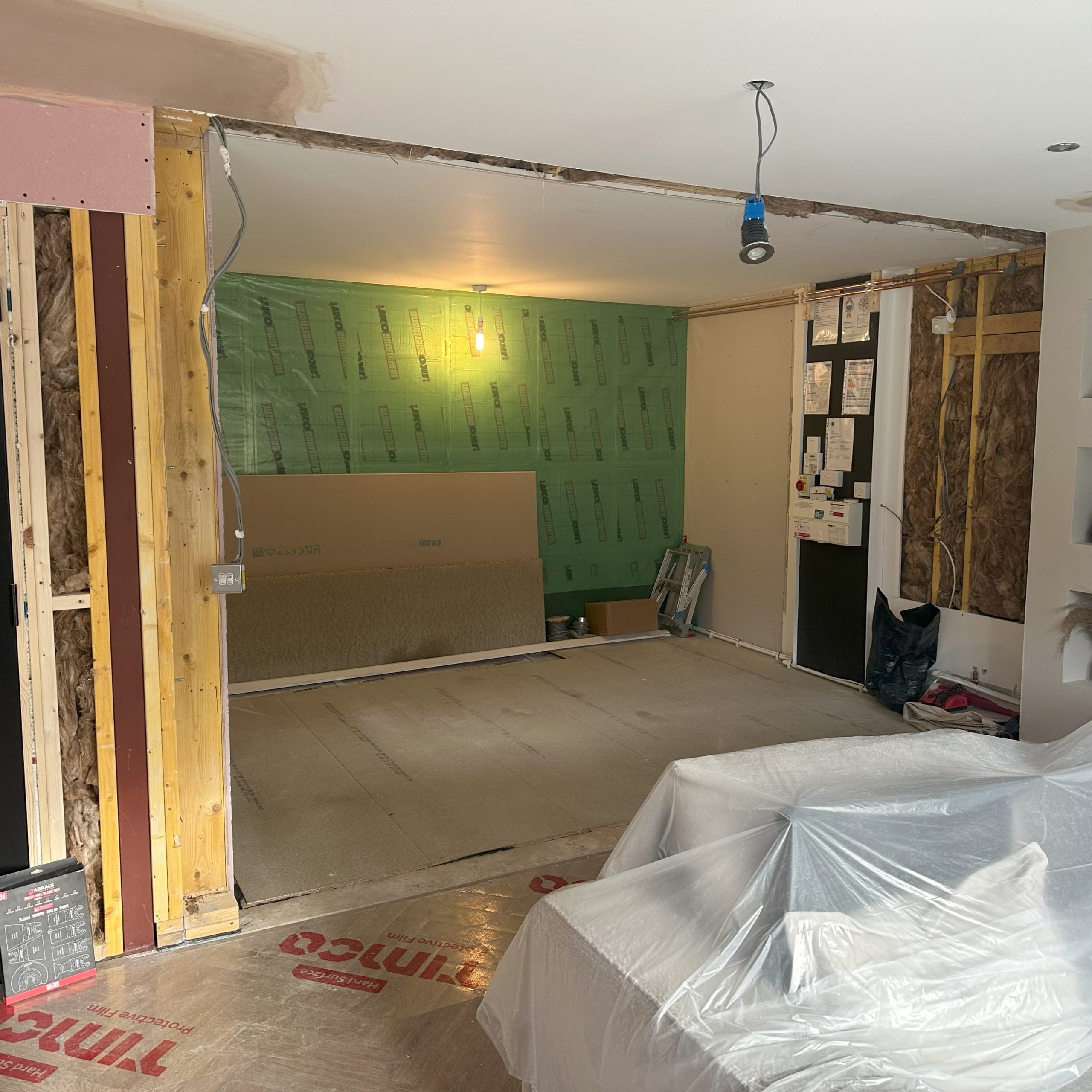Complete reconfiguration of the ground floor to create open plan living arrangement. Structurally load bearing wall between kitchen and livingroom removed and replaced with steel which was integrated within the ceiling void to create a smooth finish throughout.