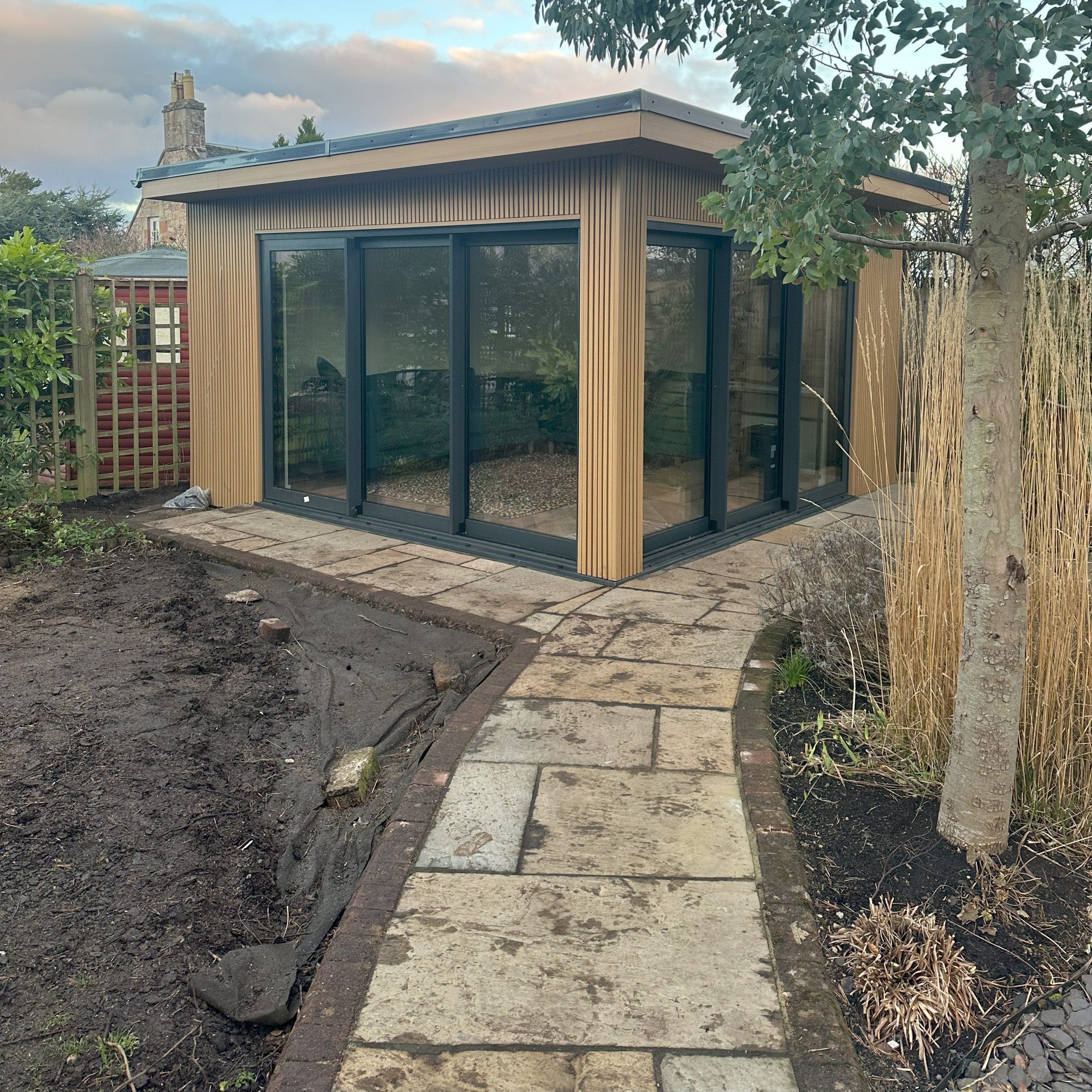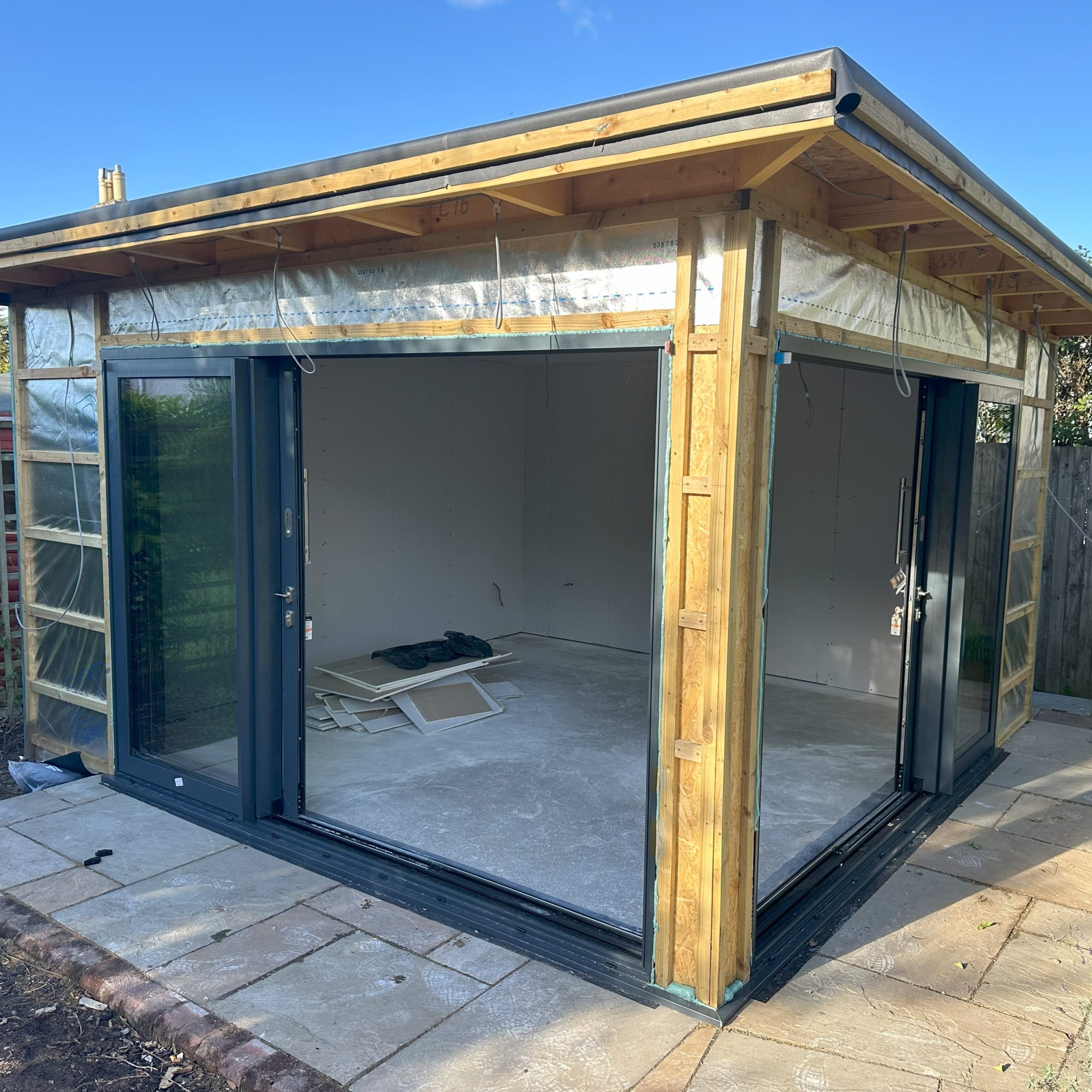 EPDM roof applied and fully clad in Oak effect composite cladding by Ecoscape. Smart electric heating and lighting installed and Ethernet run out to the house to provide a lovely office/chill out zone for our clients to enjoy.