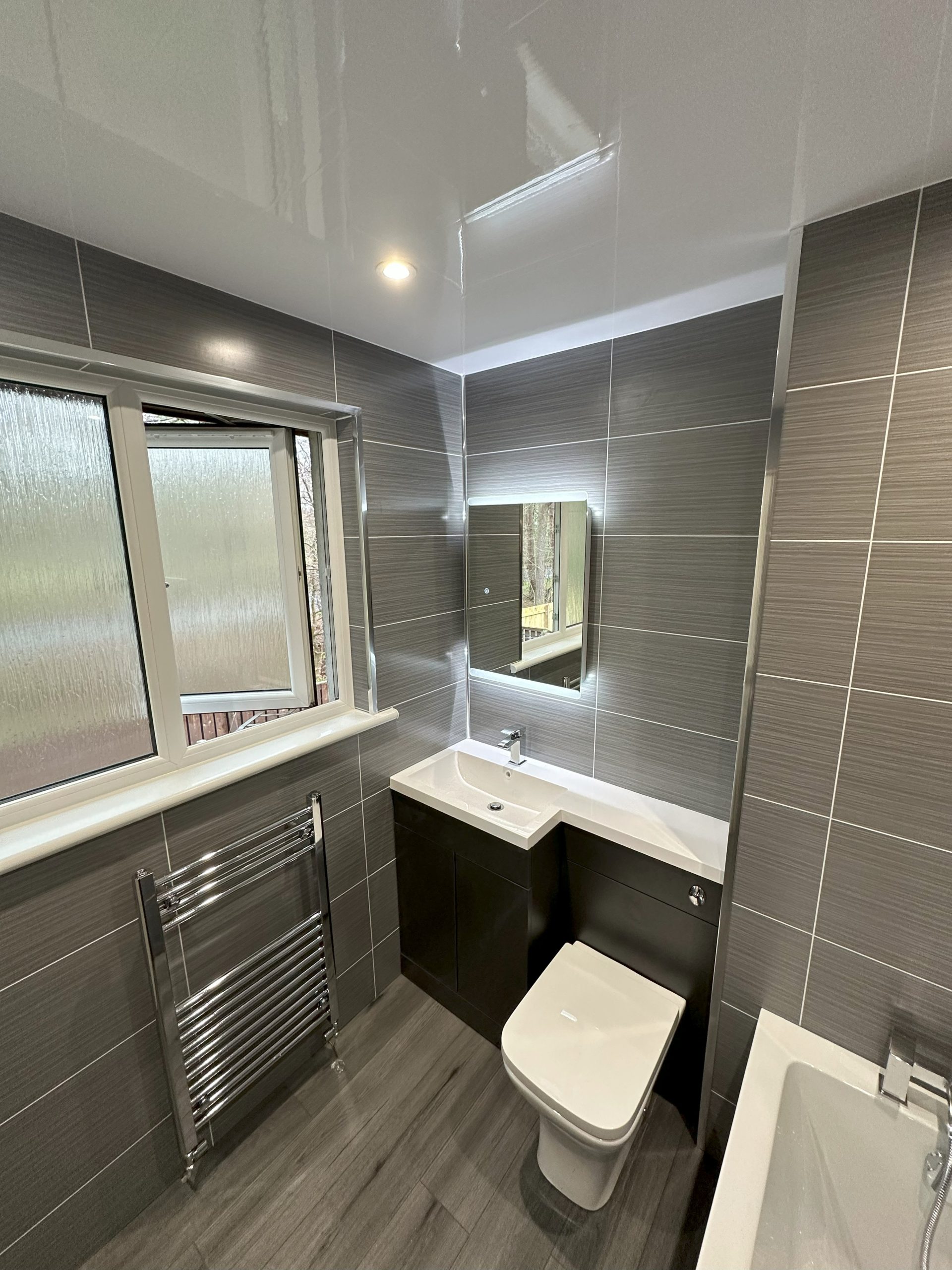 New bathroom. Existing bathroom stripped back to bare and new wall and ceiling paneling installed. All new services installed to suit new suite.